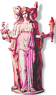 Bogini Hekate jest najczęściej kojarzona z magią, lecz nie była to jej jedyna domena - kojarzono ją też z jedną z bogiń pomagającą odbierać porody, tą nadającą dzieciom ich tajemne "duchowe" imiona, a także opiekunkę wszelkich bram, przejść i rozstajów dróg, co tworzy pewne podobieństwo z rzymskim bóstwem Janusem, ujawniając także fizyczne podobieństwo - gdyż boginię Hekate przedstawiano o trzech twarzach, a Janusa o dwóch. Niektórzy rzymscy autorzy uznawali boginię Hekate za siostrę, matkę, lub córkę bóstwa Janusa. Jakiekolwiek by nie było jej pokrewieństwo z bóstwem Janusem, jej współczesne skojarzenie ze złem jest błędnym wytworem ciemniackiej kultury postmodernistycznej, a w duchowym spektrum mitologii i tradycyjnej religii greckiej zdecydowanie nie powinna być jako taka postrzegana, gdyż władzę nad ciemnością posiada w ten sposób, że usuwa ciemność z pomocą niebiańskich pochodni czyli z pomocą Ognia i Światła.