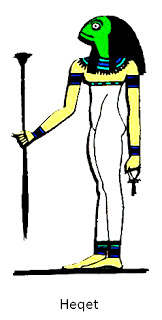 Uderzające jest też podobieństwo imion Hekate i egipskiej Heket, Heqet, Heqat czyli Ḥaqātat (HQT); bogini z głową żaby siedzącej w lotosie (padmasana), opiekunki rodzących, związanej z zaświatami i Ozyrysem. Imię oznacza wielką władczynię, od HqAt. Żaba, nieodłączny składnik zestawu magicznego wiedźm i czarownic, to prastary symbol boskiej magii. Jest związana z deszczem i płodnością Ziemi, które w Egipcie stanowiły o losie milionów ludzi. Egipska bogini Heket (Heqet, Ḥaqātat) nocą steruje Łodzią Księżyca, a w ciągu dnia prowadzi ją przez krainę podziemi. Egipskie słowo hheka oznacza magię, Heket jest więc również boginią-czarownicą, wiedźmą i szamanką, Królową Magów lub samą Magią. Starożytni przedstawiali ją również jako kobietę lub istotę o kobiecej sylwetce z głową płaza (żaby). Żaby w starożytnym Egipcie były symbolem życia, płodności i cudu narodzin. Jej małżonkiem jest Chnum (Khnun) - boski garncarz o głowie barana, lepiący z gliny sylwetki ludzkie. Jednym z atrybutów bogini Heket (HQT) jest symbol życia anch czyli krzyż egipski. Jej miejsca kultu to: Her-ur, okolice Hermopolis, czczono ją również w Abydos. Małżonkiem bogini Heqet (HQT) jest bóg Khnum (KhNM), Khnemu, opiekun źródeł Nilu, trzeci aspekt solarnego boga Raa, bóstwo odrodzenia, stworzenia i wieczornego Złotego Słońca. Żaby w starożytnym Egipcie były symbolem życia płodności i cudu narodzin oraz odrodzin, zatem kobiety oddawały się w opiekę Bogini Heqet czy Heqat na czas poczęcia, ciąży, porodu i macierzyństwa.
