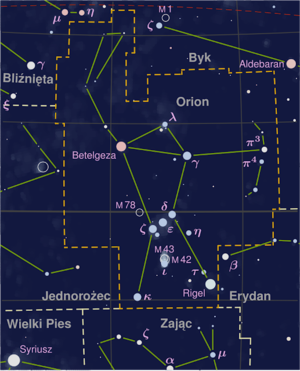 Orion to najpiękniejszy gwiazdozbiór Nieba. Można go obserwować na południe od od konstelacji Bliźniąt i Byka. Orion leży na skraju Drogi Mlecznej, która przechodzi przez jego górną część, ponad gwiazdą Betelgeuse. Orion jest 26-tą co do wielkości konstelacją położoną w obszarze równika niebieskiego. To znaczy, że gwiazdy znajdują się na obu półkulach niebieskich. Orion uznawany jest za najpiękniejszy gwiazdozbiór nieba. Jego charakterystyczną figurę, utworzoną przez jasne gwiazdy, odnajdziemy na południe od konstelacji Bliźniąt i Byka. Przez ten typowy gwiazdozbiór nieba zimowego przebiega równik niebieski. Orion leży na skraju Drogi Mlecznej, która przechodzi przez jego górną część, ponad gwiazdą Betelgeuse.